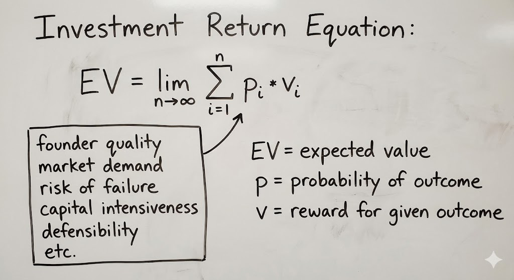 In VC, in particular, an interesting situation arises in which a small number of companies drive the vast majority of returns. So in the above equation, the only probabilities that matter are the ones attached to very large outcomes.