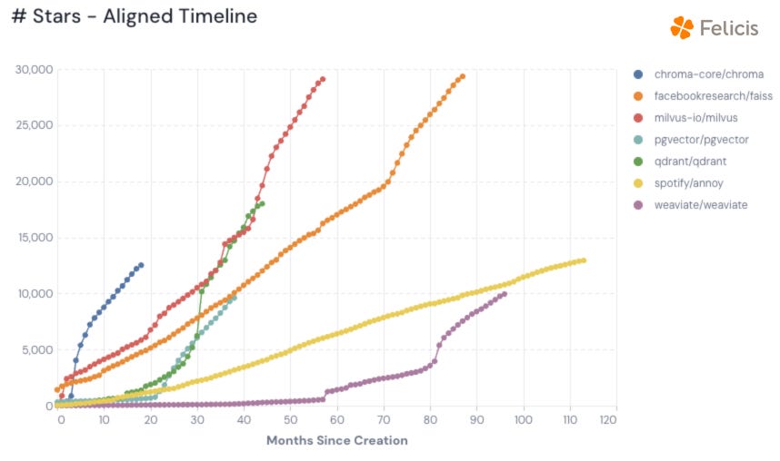 The other good metric to get a feel for developer adoption is open-souce trends on GitHub. I pulled some of the most popular open-source databases over time on GitHub here: