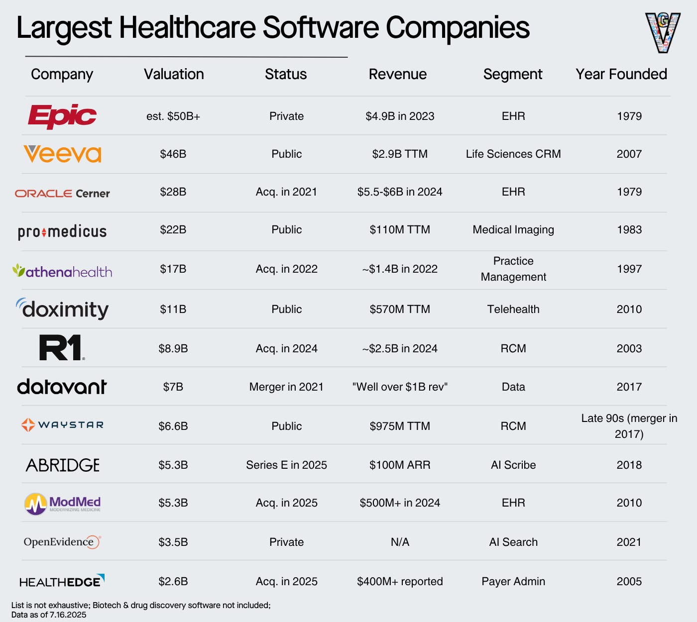 Given our focus on AI in healthcare today, I don’t want to bog you down with an exhaustive list of companies. I’ll point out the largest healthcare software companies: