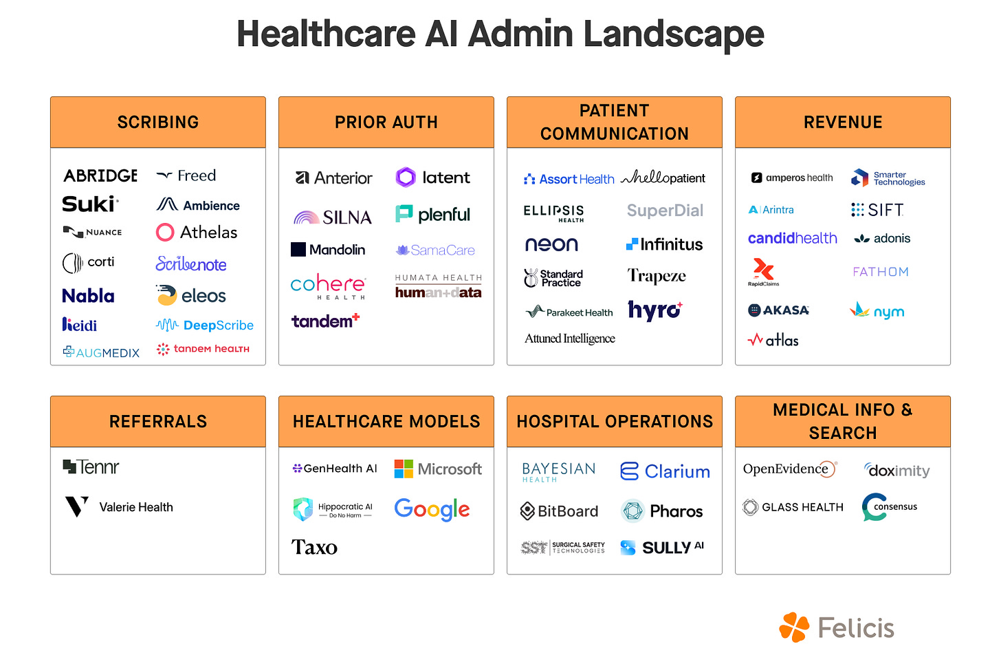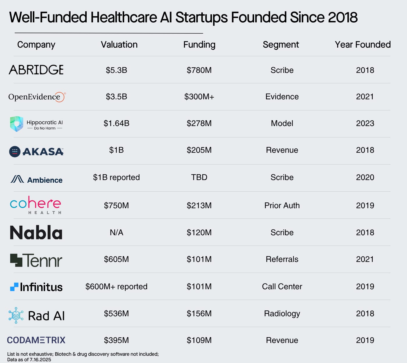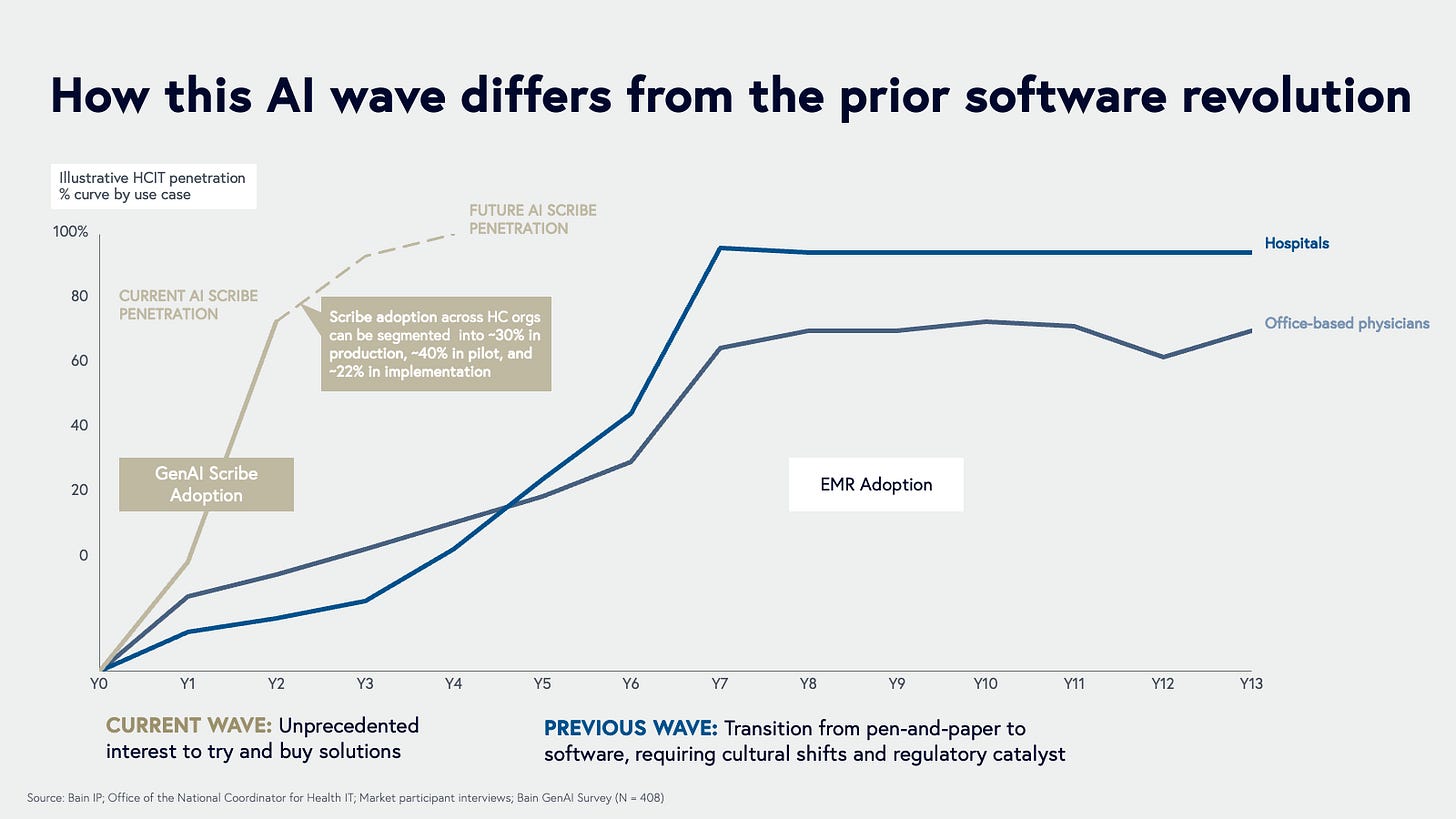 Scribing: Starting with the patient visit, AI scribes take notes for clinicians so that they can focus on engaging with the patient. Abridge is now valued at $5B, and two other unicorns have been created in the scribing market. When I talk about AI being adopted way faster in healthcare than any previous software, this is what I’m talking about.