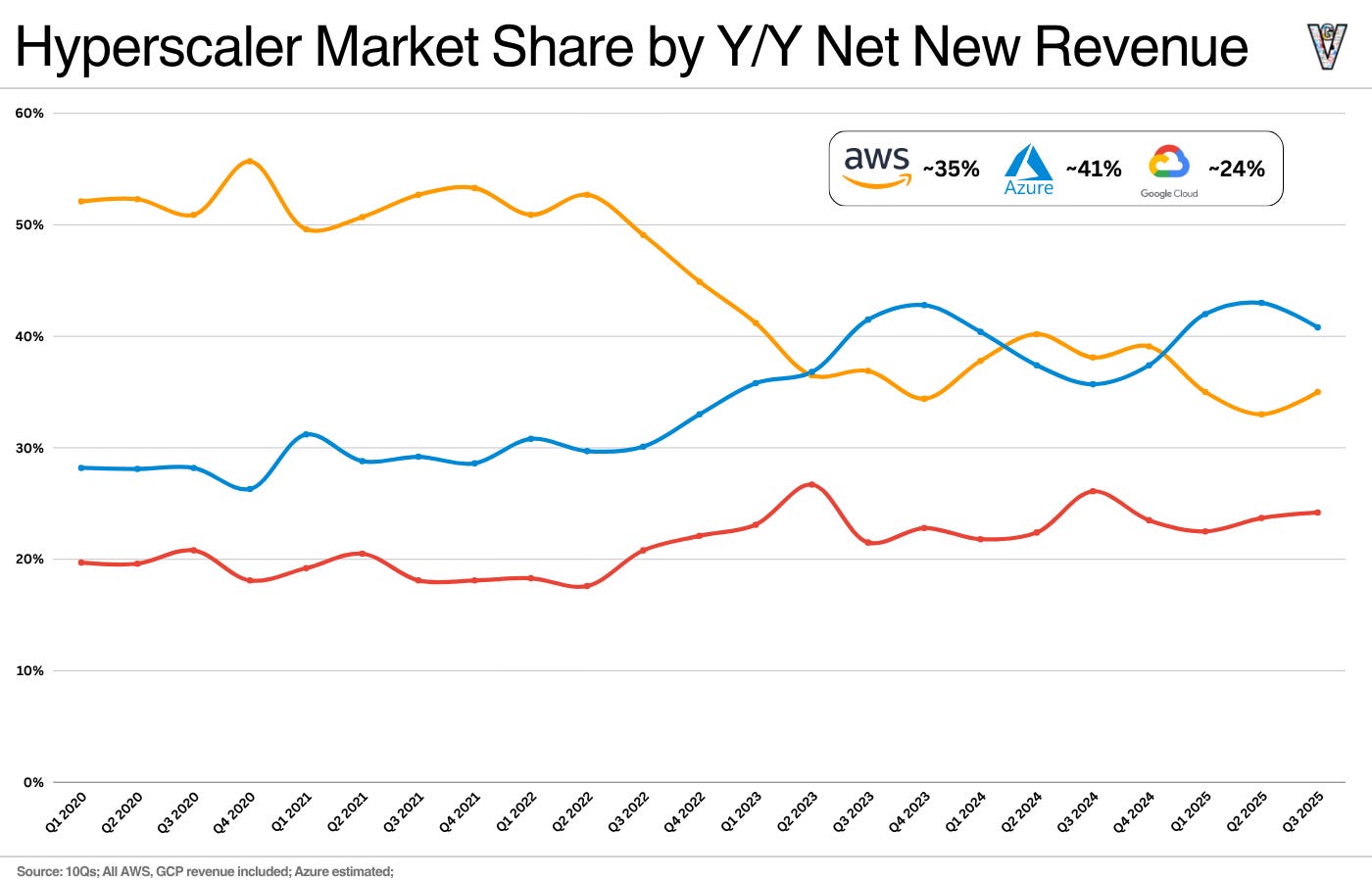 A better way to view market share changes is through Y/Y net new revenue: of the net new cloud revenue generated over the last four quarters, how much did each capture?